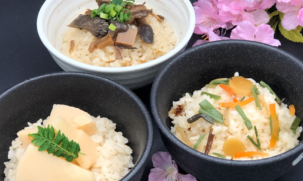 お米を炊くときに混ぜるだけ。具沢山で旨味たっぷりのごはんを味わうことができます。山菜、きのこ、たけのこ、と具材はさまざま。いりこ・鰹節・昆布などの京風だしでお楽しみください。